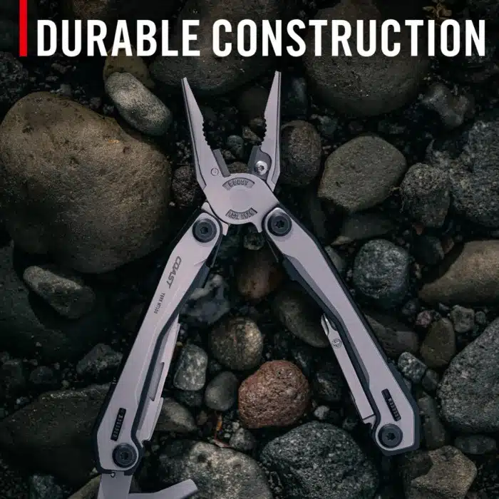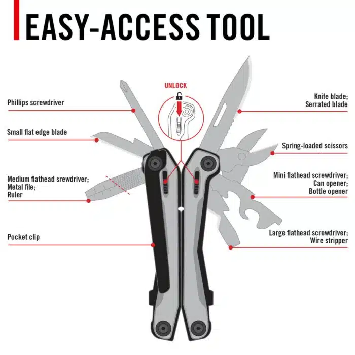 16 integrated tools including wire cutters, scissors, knife, file, and screwdrivers